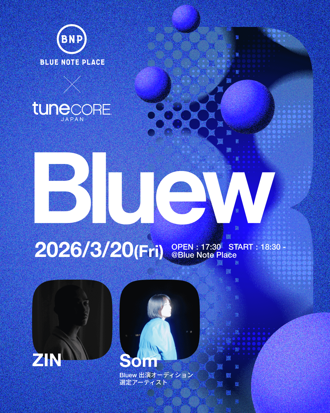 3月20日、TuneCore Japanと東京・恵比寿のBLUE NOTE PLACEがコラボレーションしたライブイベント『BLUEW』が開催された。