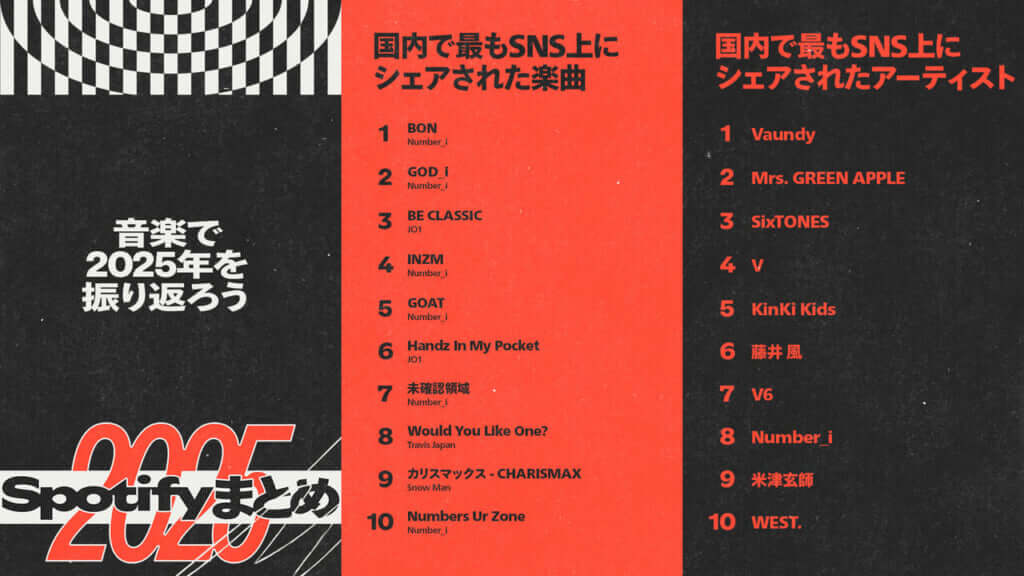 国内で最もSNS上にシェアされたアーティストでは、Vaundyが1位を獲得、2位にMrs. GREEN APPLE、3位にSixTONESが続いた。さらに、VやKinKi Kids、藤井 風、米津玄師、そして今年特に注目を集めたNumber_iもランクインし、ジャンルを越えて多くのアーティストがSNS上で話題となった一年だった。