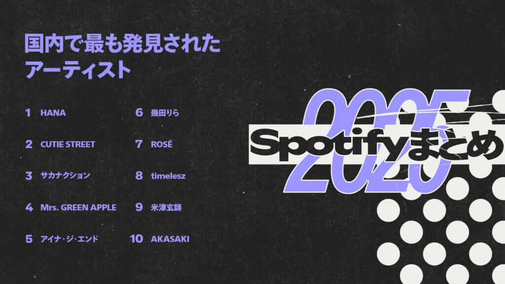 Spotifyは、世界中のユーザーがSpotify上での聴取履歴から自身のこの一年を振り返ることができる年末恒例企画「Spotifyまとめ2025」を本日公開した。今年最も聴いたアーティストや楽曲、音楽ジャンルのほか、音楽再生時間、最も聴いたポッドキャスト番組などのデータを、Spotifyアプリ上で楽しむことができる。また結果はシェアカードとしてInstagramのストーリーや、X、Facebookなどのソーシャルメディアで簡単に共有できる。