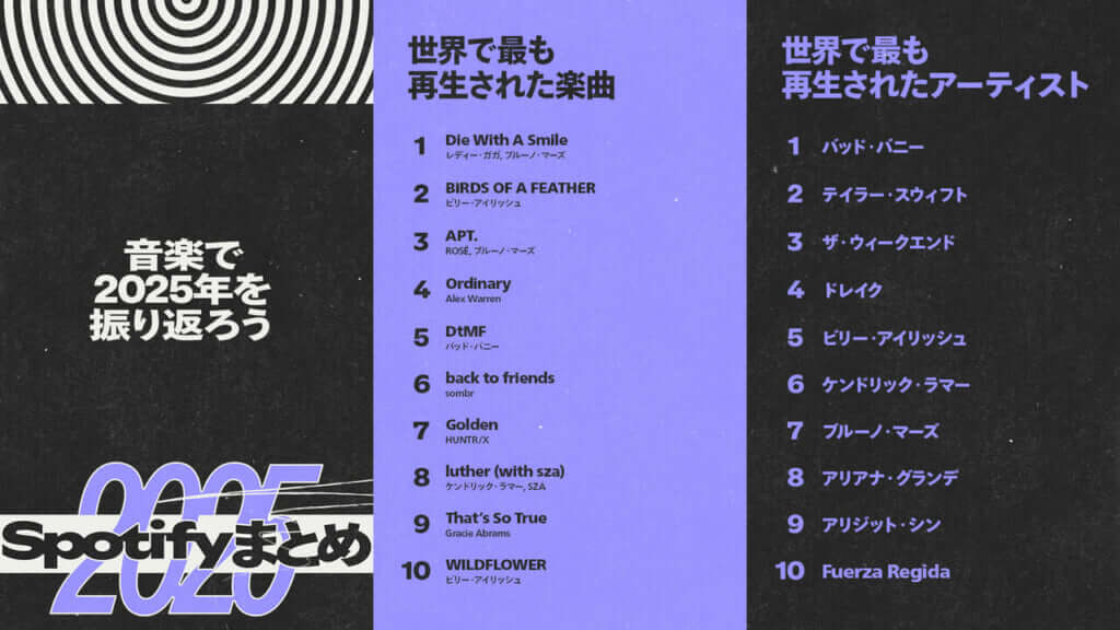 世界で7億1,300万人以上が利用するオーディオストリーミングサービスSpotifyは、音楽やポッドキャストなどの今年のリスニングデータから2025年を振り返る各種ランキングを発表した。
