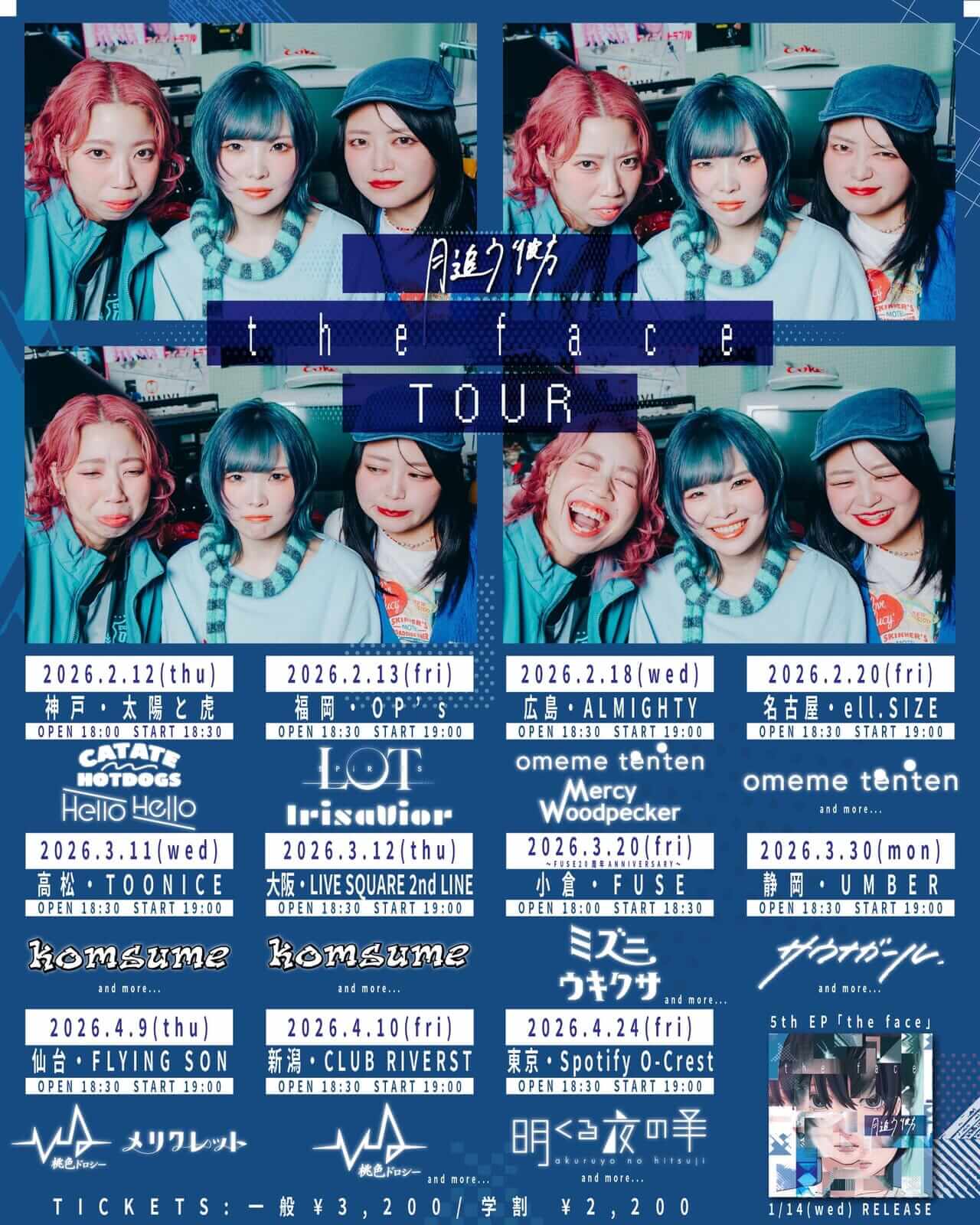 “あの頃”への憧れをサウンドに込めて、そして今を生きる葛藤を言葉に宿して。月追う彼方が1月14日にリリースした新作EP『the face』は、等身大の3人の進化が詰まった渾身の一作だ。2025年1月にななみ(Dr/Cho)が正式加入してから約一年間、完全体のスリーピースバンドとして全国各地のライブハウスやサーキットイベントを駆け抜けてきた。そんな活動の充実を物語るような楽曲たちが、時に鋭く、しかし響き豊かに掻き鳴らされている。